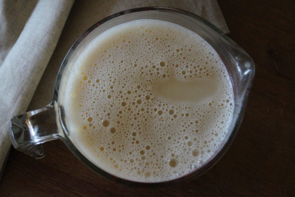 Ich habe 110 g Spielberger Haferflocken mit 75° heißem Wasser 40 Sekunden lang mit einem Hochleistungsmixer gemixt, drei Tropfen Enzym N1 zugegeben, nach 40 Minuten (bei 60°) drei Tropfen Enzym N2 zugegeben und 60 Minuten lang einwirken lassen, danach mit dem Nussmilchbeutel abgefiltert.