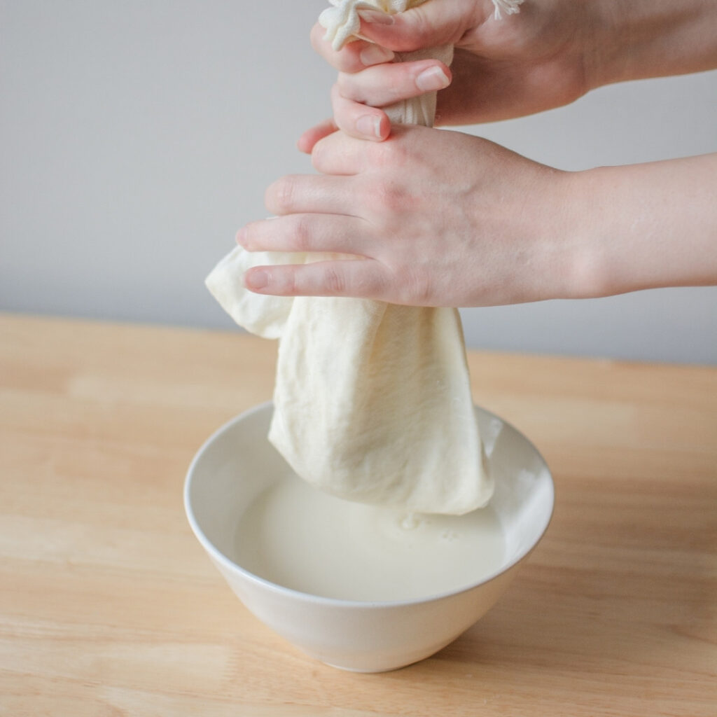 Aus pflanzlicher Milch und Nigari entsteht frischer Tofu: Nach dem Gerinnen die Masse durch den Filterbeutel oder das Seihtuch abseihen, pressen und fertig ist dein selbstgemachter Tofu. Ganz ohne Plastikverpackung!