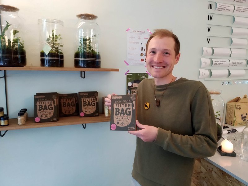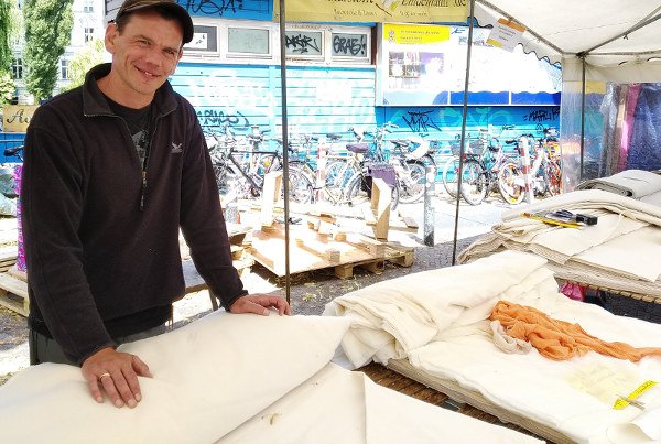 Ein Einblick in die inhaberingeführte Näherei in Berlin. Hier sind ein Teil der Materialien zu sehen, wie das Nähgarn und die Vorlage für den Zuschnitt durch Wanda. Unser Textilexperte mit den besten Stoffen ist der freudige Oliver. Weitere Arbeitsschritte werden von Larissa beim Nähen der Leinenfilter und dem Einfügen der Kordel durchgeführt. Patrick näht auf dem Foto gerade die Baumwoll Nussmilchbeutel. Es folgen Produktkontrolle, das Falten und Verpacken. Dabei unterstützt Diana aus der Nachbarschaft mit genauem Blick und flinken Händen. Anfangs haben wir die Verpackungen selbst gestempelt. Wie sie dann final im Geschäft zu finden sind zeigt Benedikt, auf dem Foto in einem Laden in Berlin.