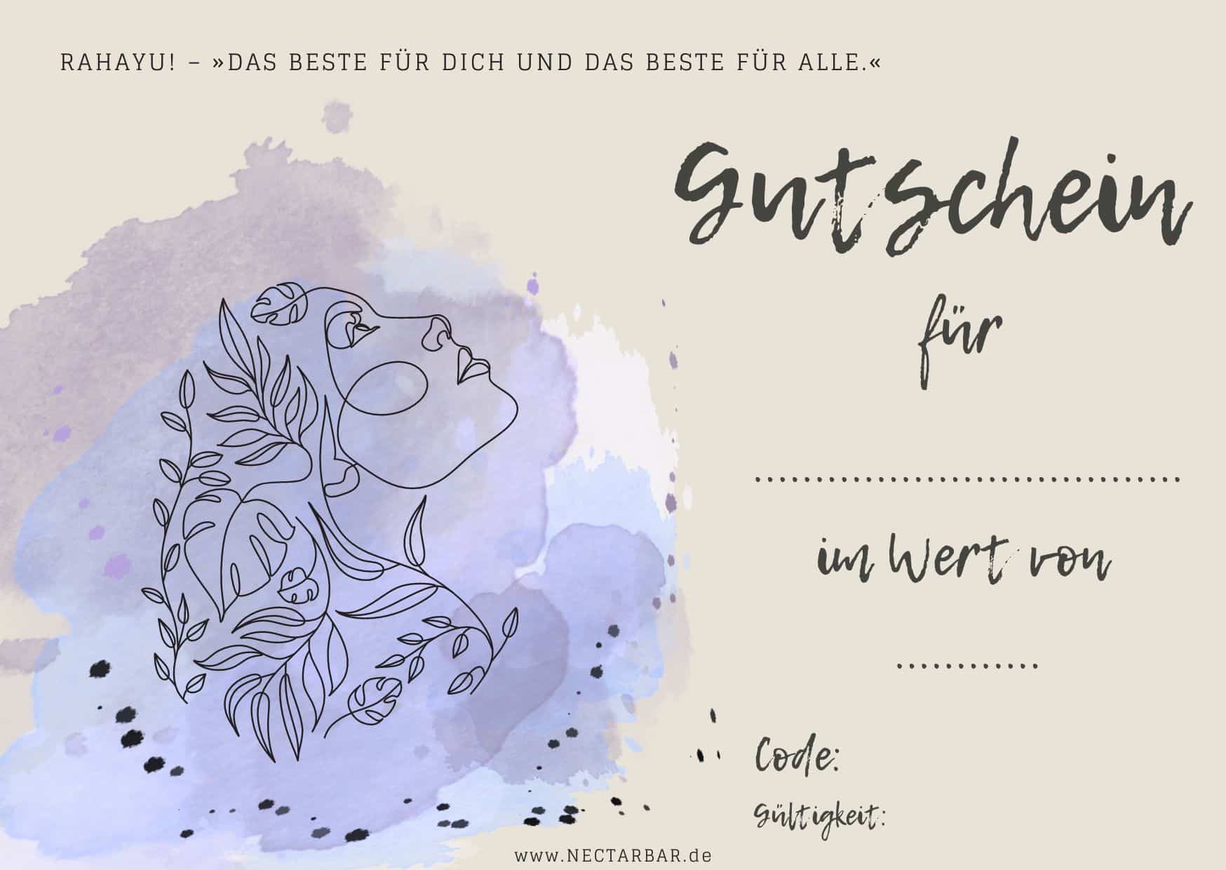 Mit der Auswahl „Karte (per Post)“ erhältst du eine von uns mit Liebe kreierte Unikat-Karte im A6 Format: Aquarellfarbe mit gestempeltem Motiv auf ökologischem Graspapierkarton. Den Gutscheinwert kannst du selbst bestimmen (ab 10 €). Auf Wunsch schreiben wir auch eine Nachricht mit auf die Karte (dazu die Box „optionale Nachricht“ ausfüllen). Soll die Karte direkt an die beschenkte Person geschickt werden, so kann im Bestellverlauf eine abweichende Lieferanschrift eingetragen werden. Zusätzlich wird der Code auch per PDF an dich versendet. Die Kosten für Karte + Versand betragen 3,50 € (innerhalb Deutschlands).