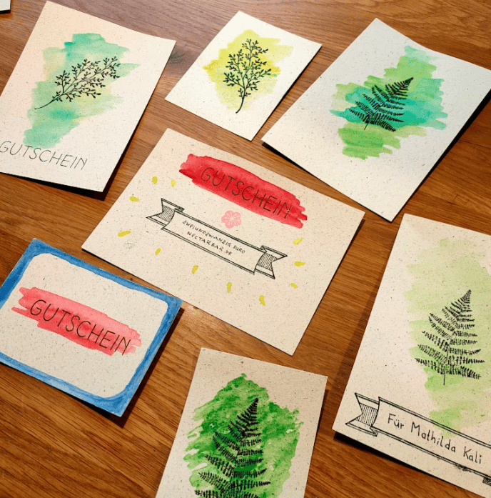 Von uns gestaltete Gutscheine auf Graspapier. Motive stehen oben zur Auswahl. Jede Karte ist einzigartig.